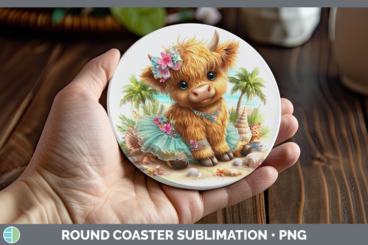 Animals Summer Beach Highland Cow Round Coaster Sublimation