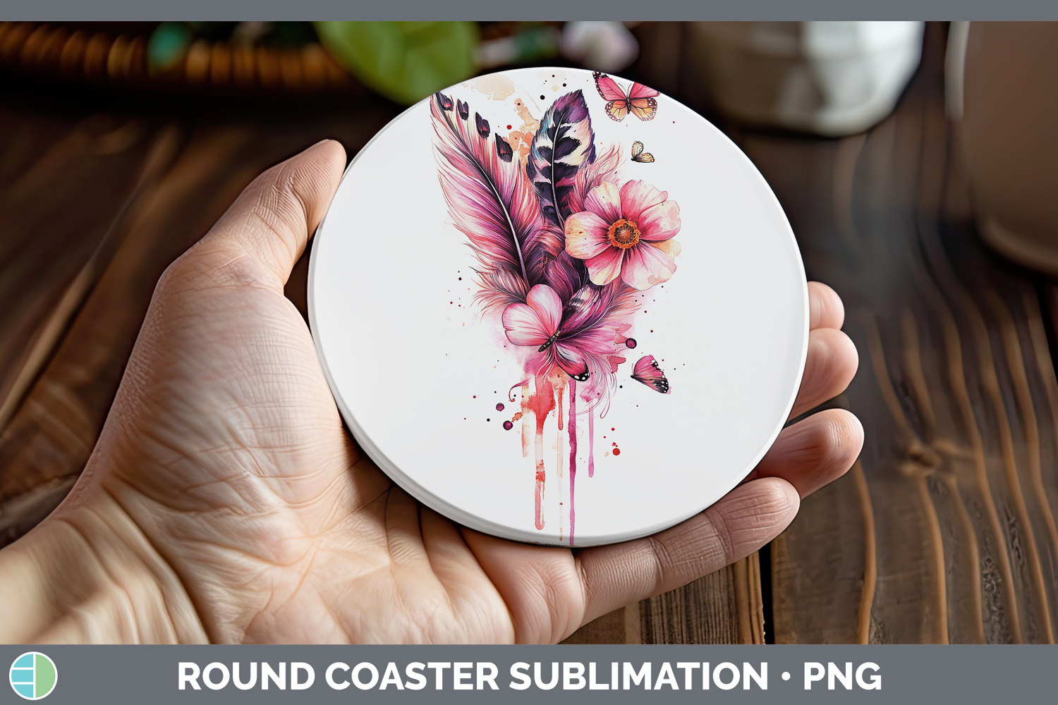 Similar Design Products to Best Sellers 04 Pink Drips Boho Feathers Round Coaster Subli