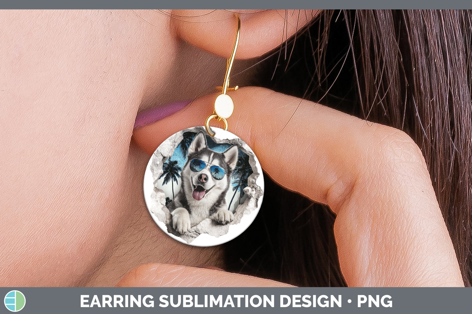 Dogs 3D Palm Tree Hole in he Wall Husky Round Earrings Subli