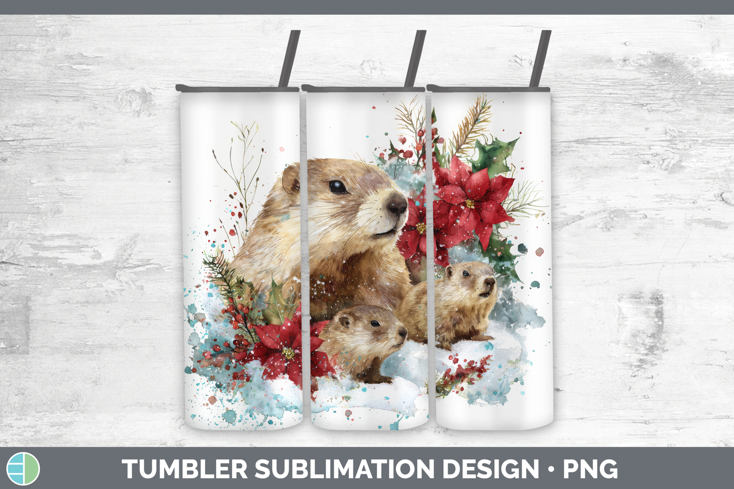 Groundhog Tumbler Woodland Christmas Poinsettia Sublimation