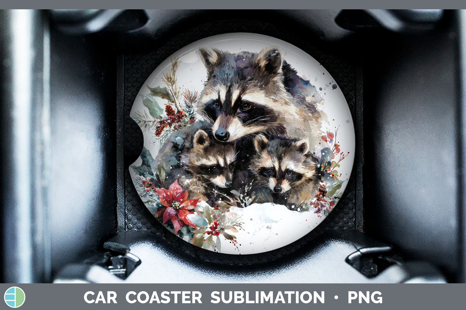 Raccoon Car Coaster Woodland Christmas Poinsettia Sublimatio