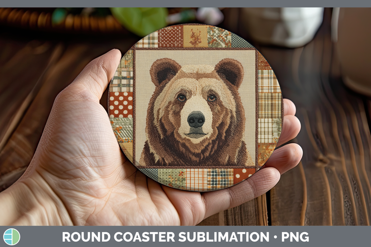 Grizzly Bear Woodland Quilted Patchwork Round Coaster Sublim