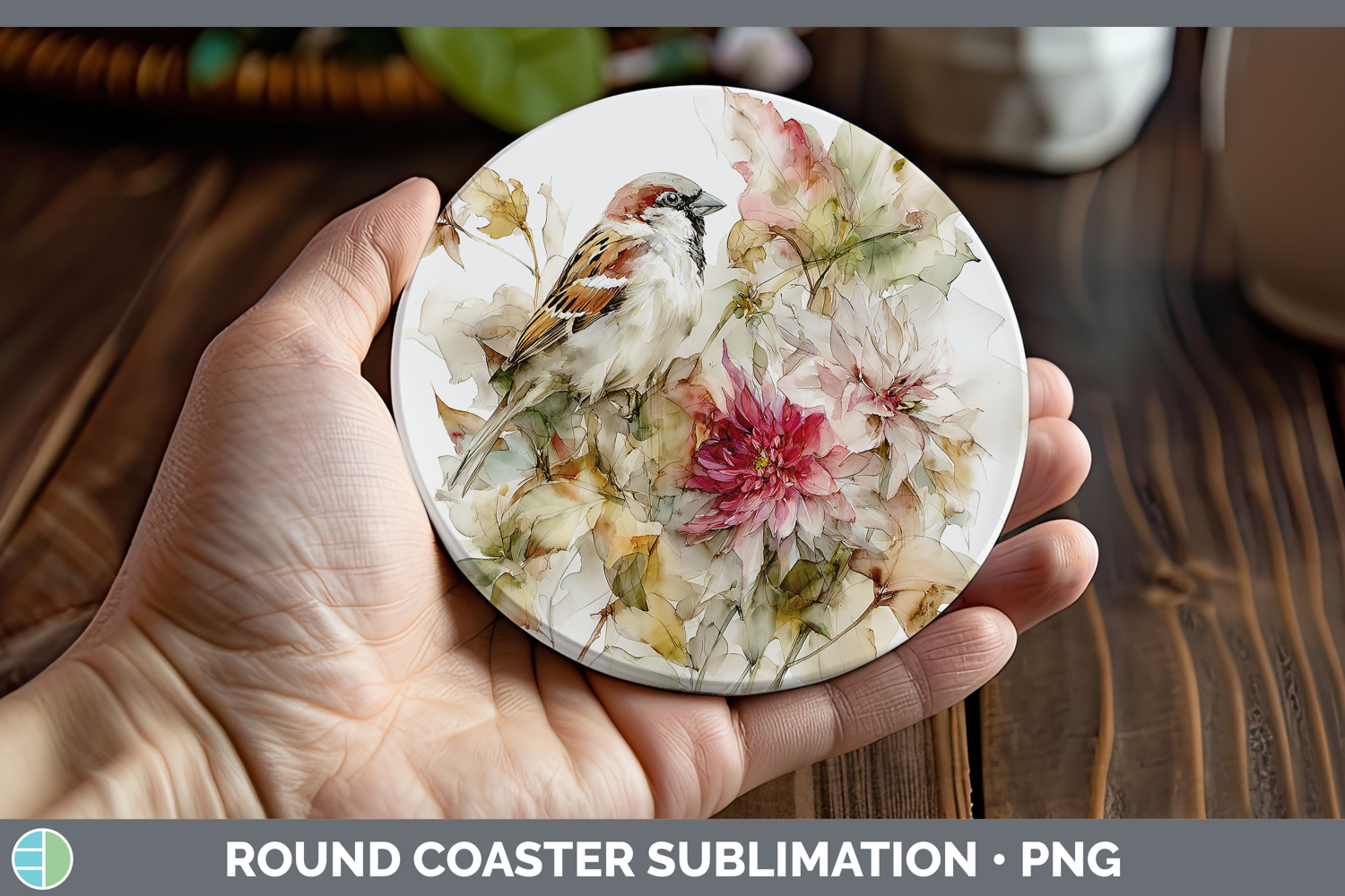 Sparrow Birds 01 Autumn Floral Round Coaster Sublimation Des