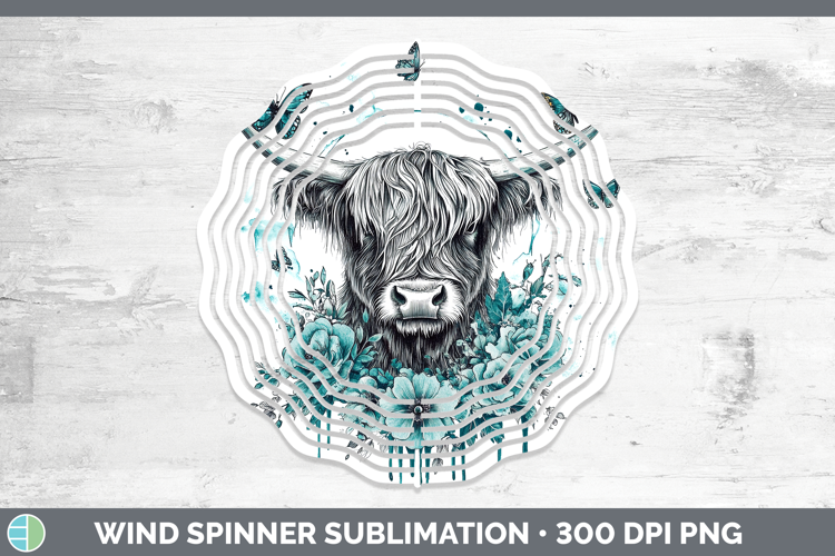 Highland Cow Farm Teal Drips Wind Spinner Sublimation Design