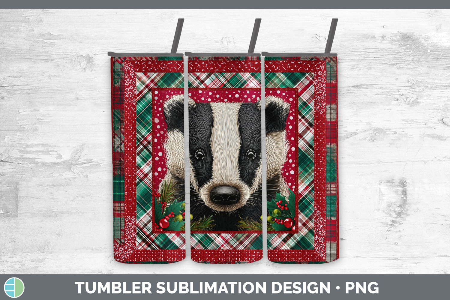 Badger Woodland Christmas Quilt Tumbler Sublimation Design