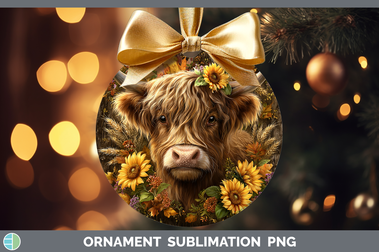 Highland Cow Farm Rustic Autumn Ornament Sublimation Design