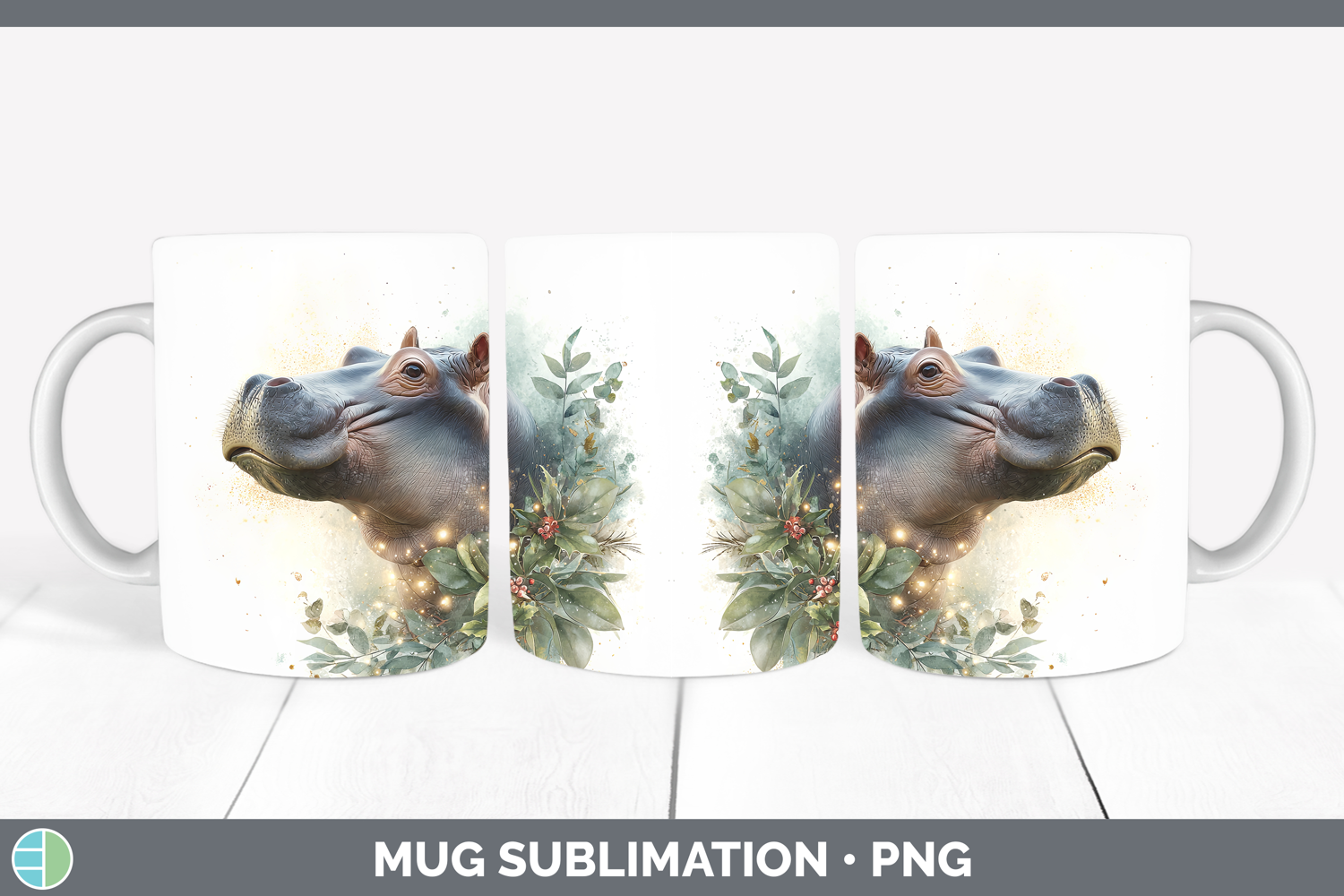 Hippo Safari Christmas Botanicals Mug Wrap Sublimation Desig