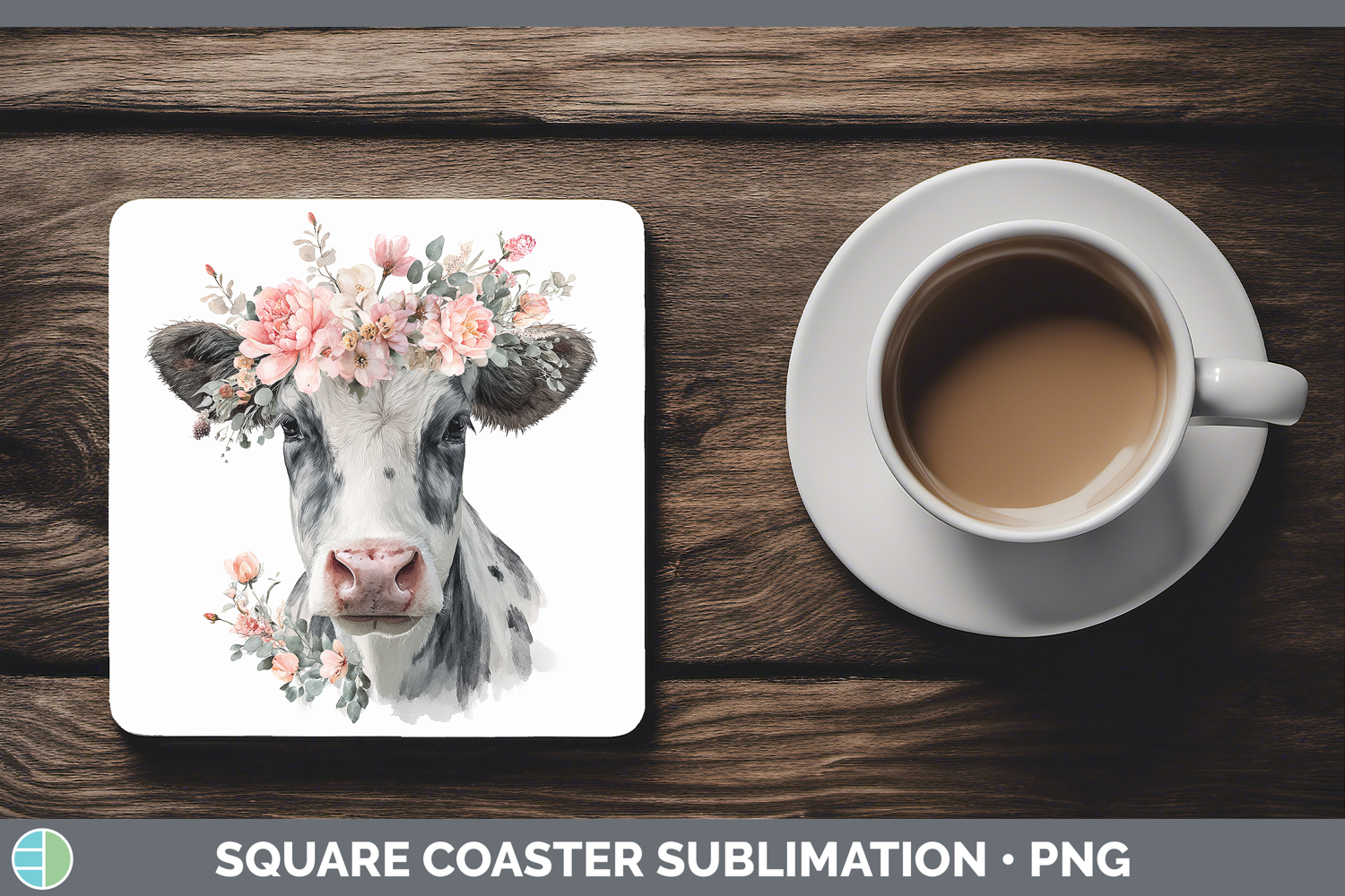 Cow Animals Floral Crown Square Coaster Sublimation Design