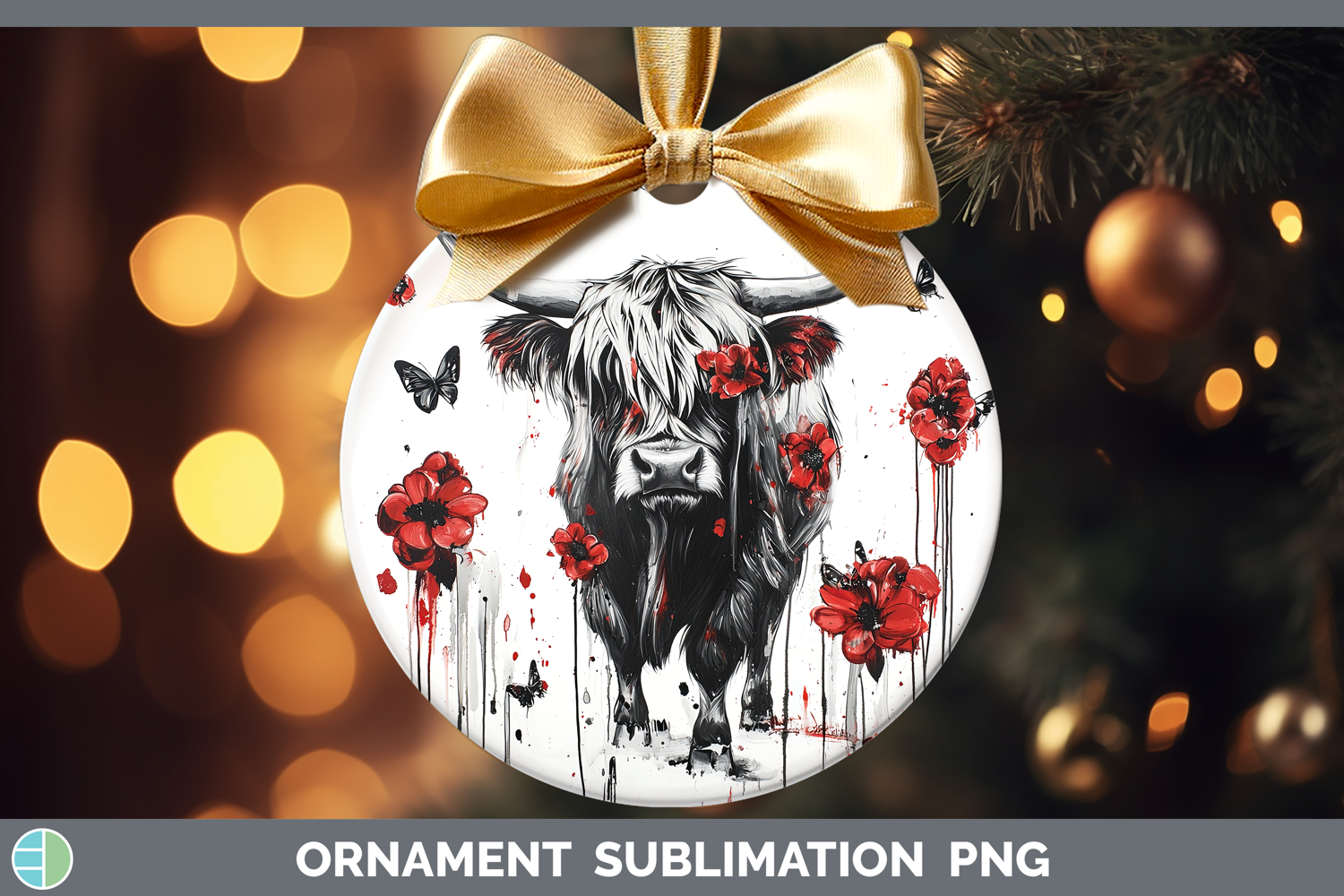 Highland Cow Animals Red Drips Ornament Sublimation Design