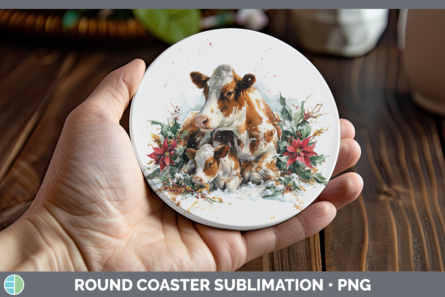 Cow Farm Christmas Poinsettia Round Coaster Sublimation Desi