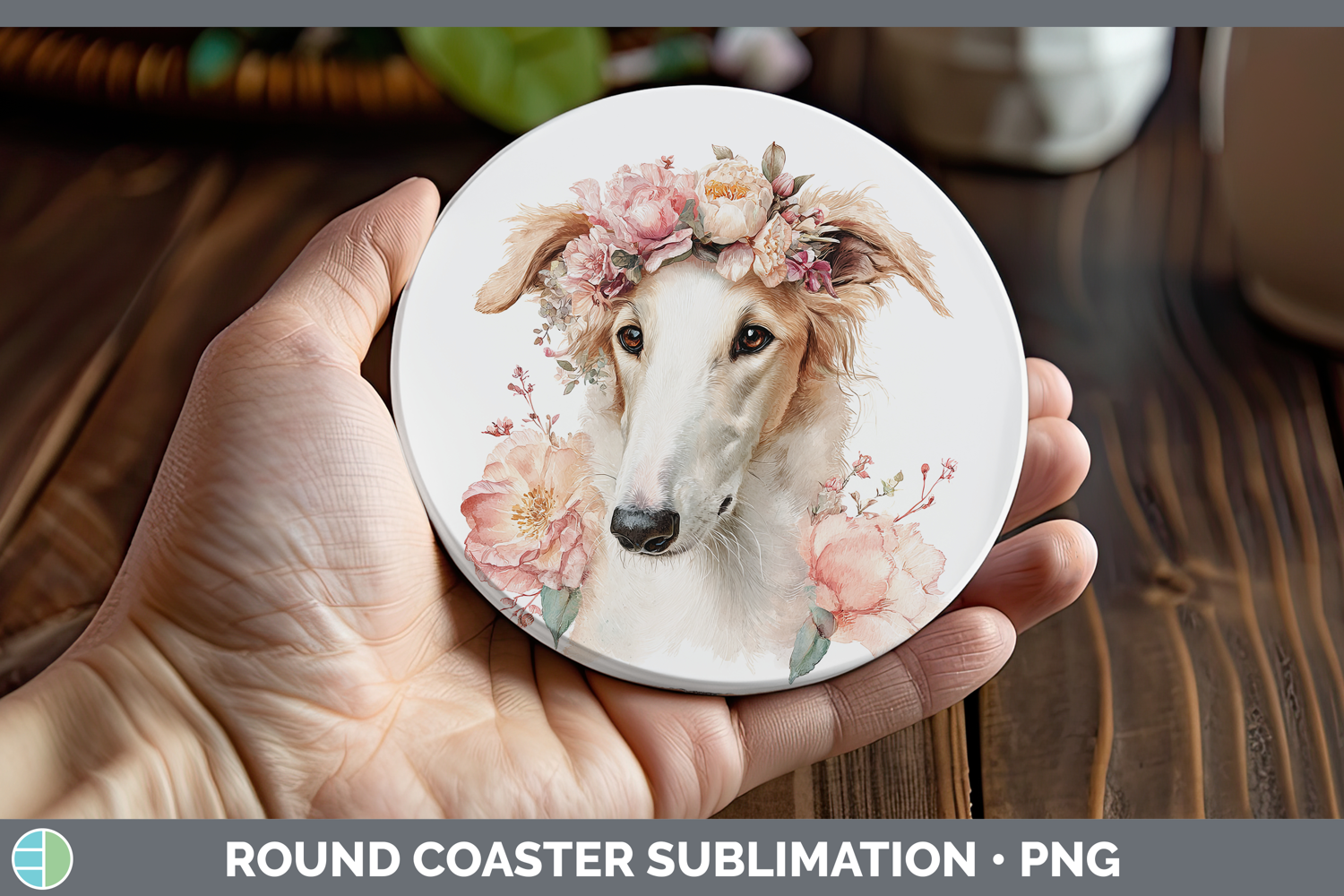 Borzoi Dogs 05 Floral Crown Round Coaster Sublimation Design