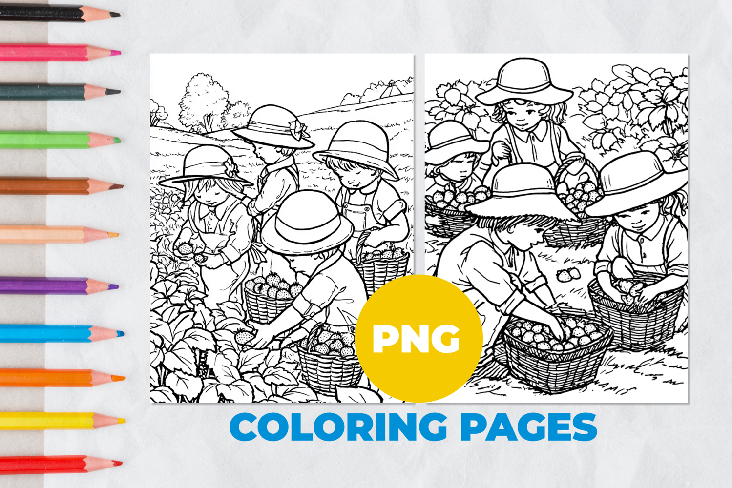 Children picking strawberries Coloring Pages | Coloring book example image 1