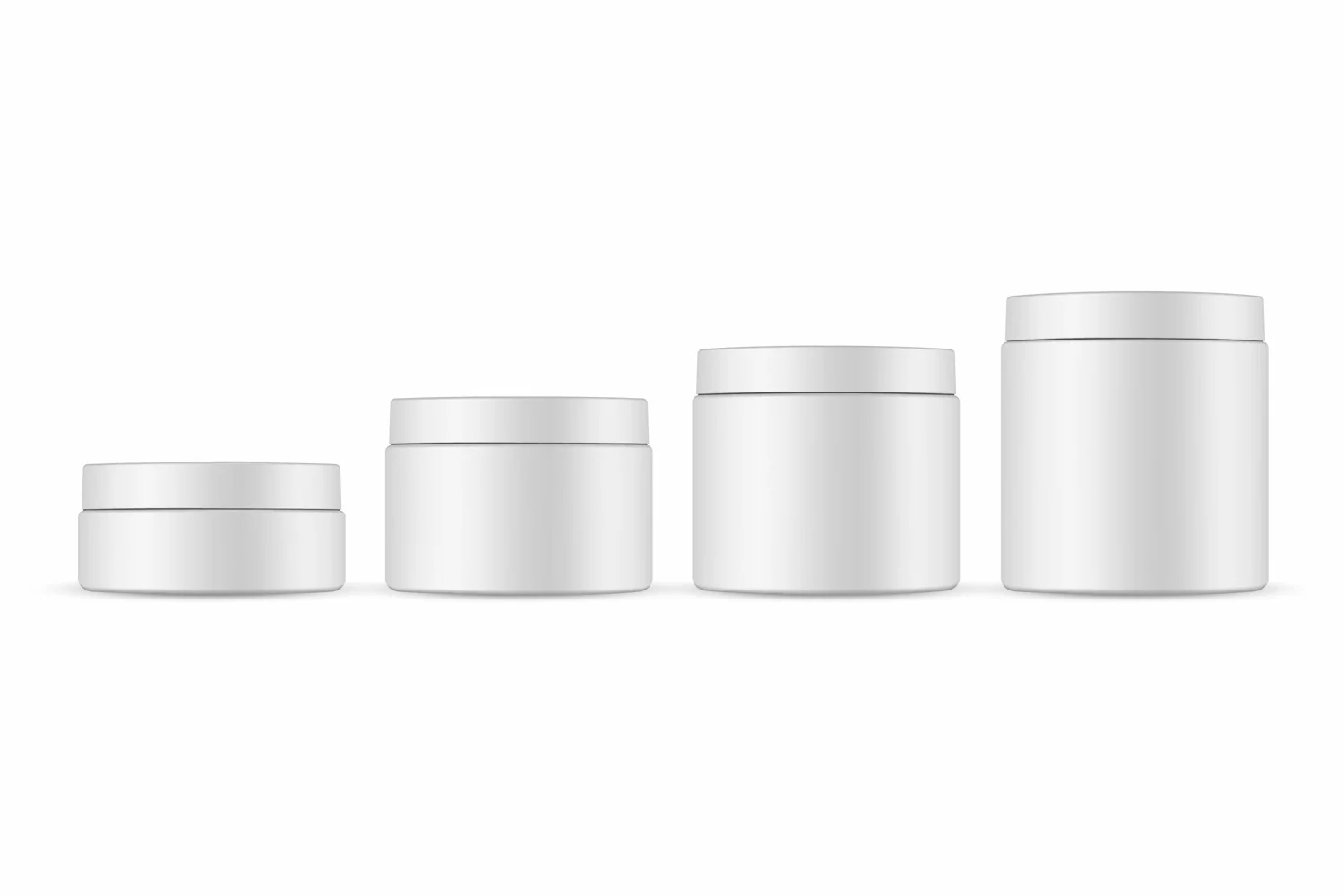 Set of four cosmetic jars mockups isolated on white background. Cosmetics packaging 50ml, 150ml, 200ml, 250 ml. Vector illustration