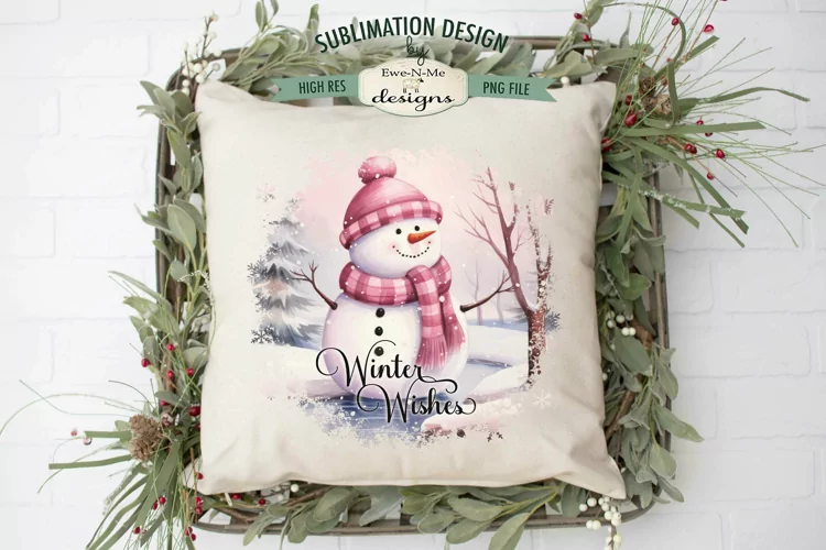 This design makes for a cute sign, pillow etc. for the holiday season, this features a pink snowman that says Winter Wishes.