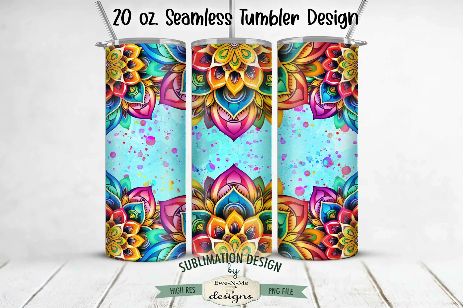 This seamless tumbler wrap design is so vibrant and cheerful. The design features rainbow colored mandalas on a speckled blue background.