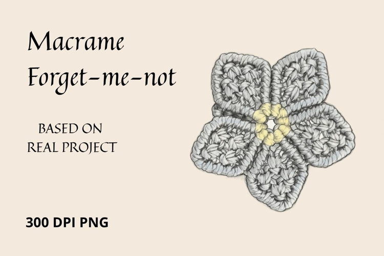 This high-resolution macrame-inspired botanical clipart features a detailed Forget-me-not flower design, created from a real handmade piece and enhanced with a pencil drawing effect. The visible thread texture combined with sketch-style lines creates a unique organic, hand-drawn look.