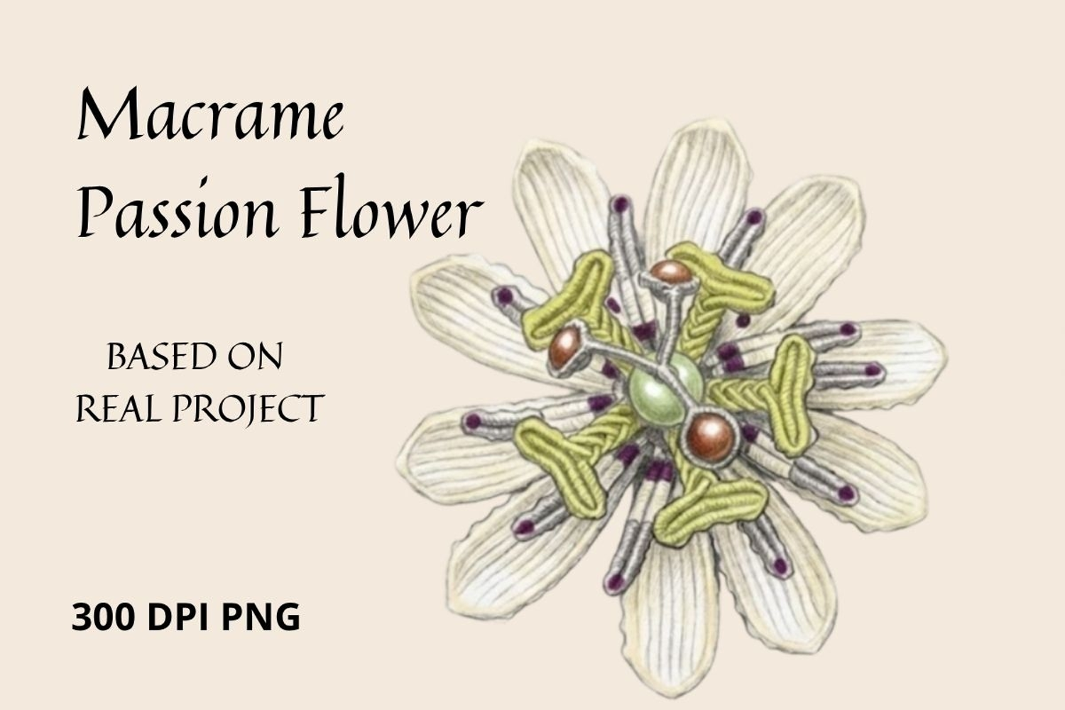 This high-resolution micro macrame-inspired botanical clipart features a detailed Passion Flower design, created from a real handmade piece and enhanced with a pencil drawing effect. The visible thread texture combined with sketch-style lines creates a unique organic, hand-drawn look.