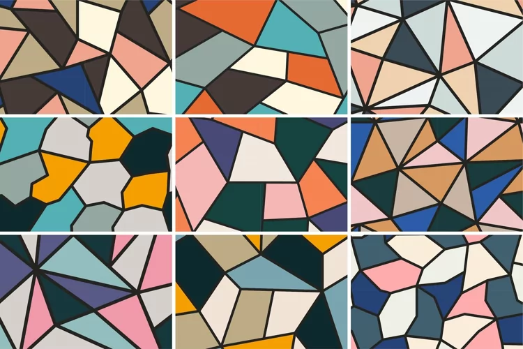 Collection of seamless colorful polygonal geometric patterns. Multicolor fashion abstract backgrounds. Mosaic bright trendy prints