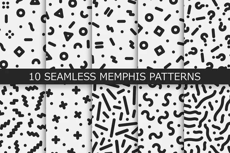 Collection of Memphis seamless vector patterns. Trendy design - 1980-1990s. Black and white textures.