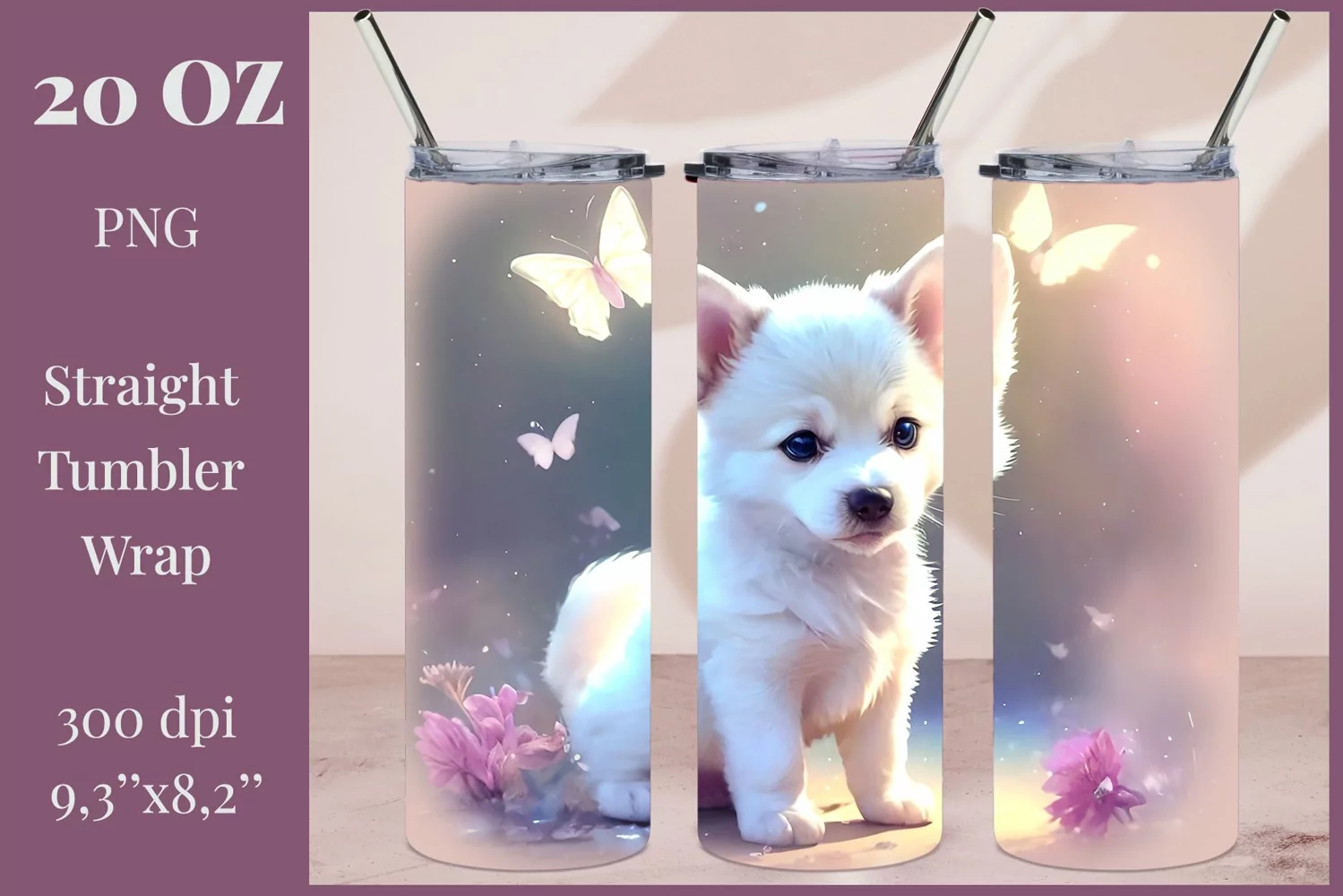 Add some cuteness to your tumbler with this adorable 3 D sublimation design, featuring a sweet puppy on a blue background with fluttering butterflies.