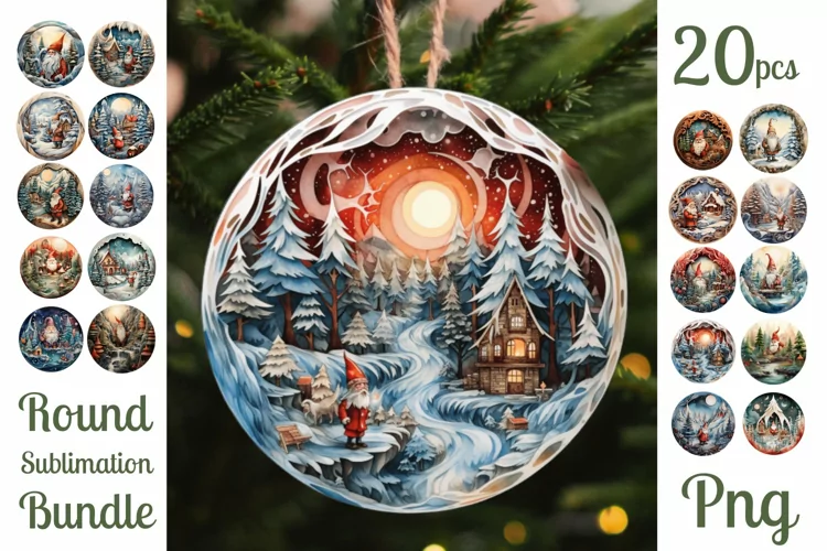 Perfect bundle of 20 round png ornament designs with gnomes for ornaments and decorations. You can use them in various ways: as Christmas tree printable ornaments, labels, gift tags, cake toppers, stickers, decorations for planers, laptops,....