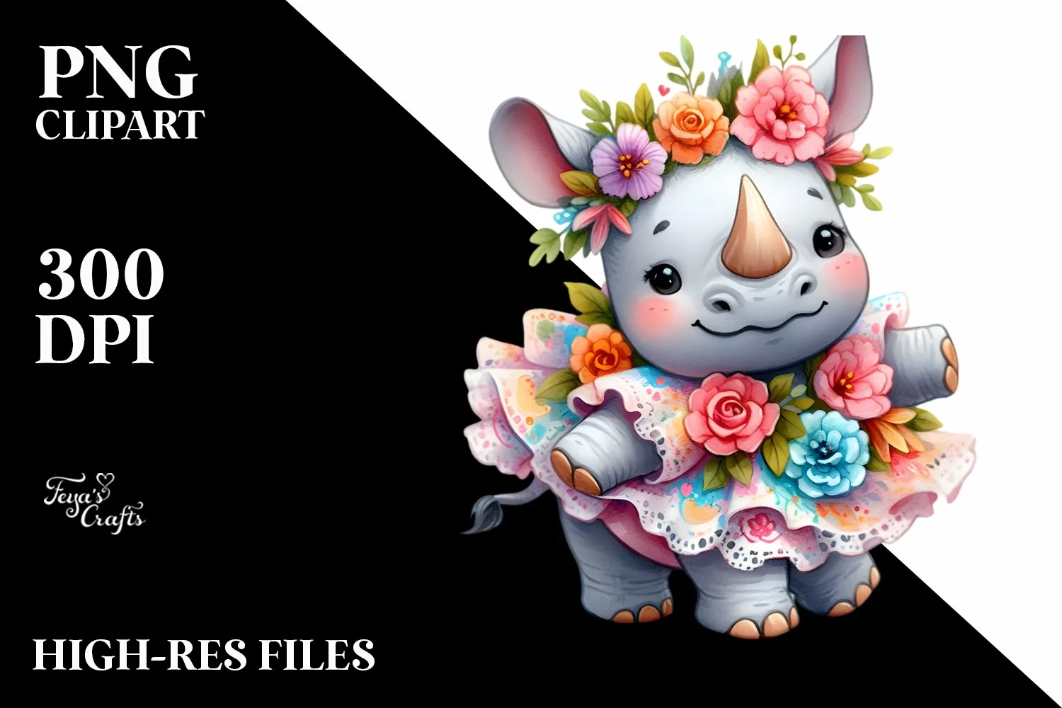Cute Baby Rhino Dressed, Flowers Clipart example image 1