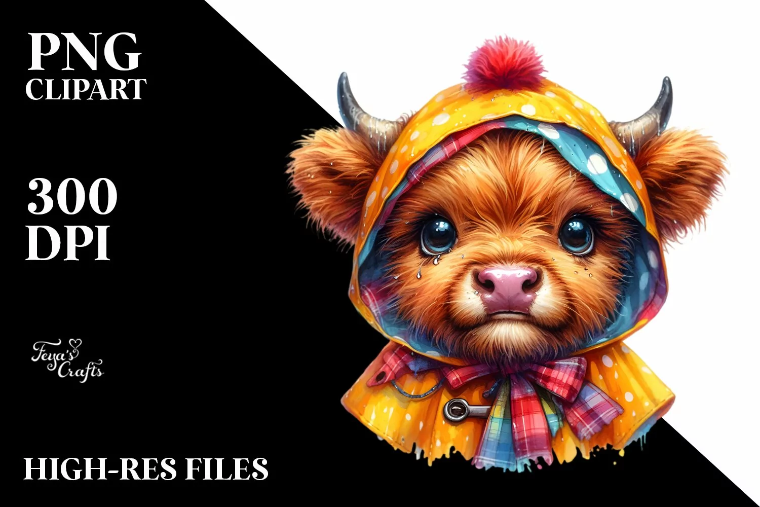 Similar Design Products to Vibrant Baby Highland Cow in Raincoat | Sublimation Clipart