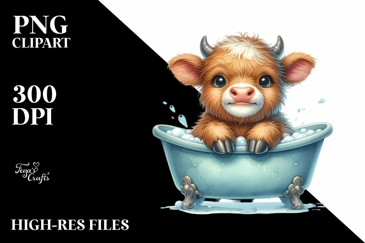 Watercolor Baby Highland Cow in a Bath Tub example image 1