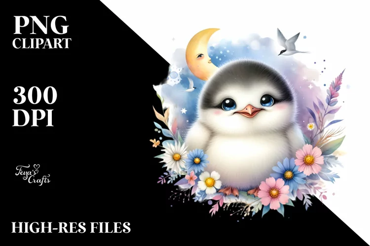 Colorful Baby Arctic Tern under Moon and Flowers | Clipart example image 1