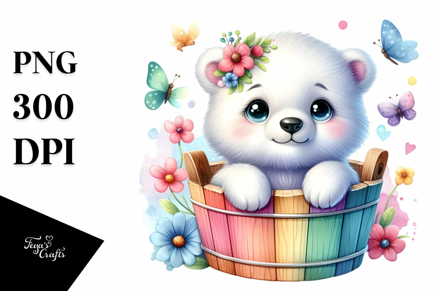 Colorful Baby Polar Bear in Wooden Bucket | Sublimation |