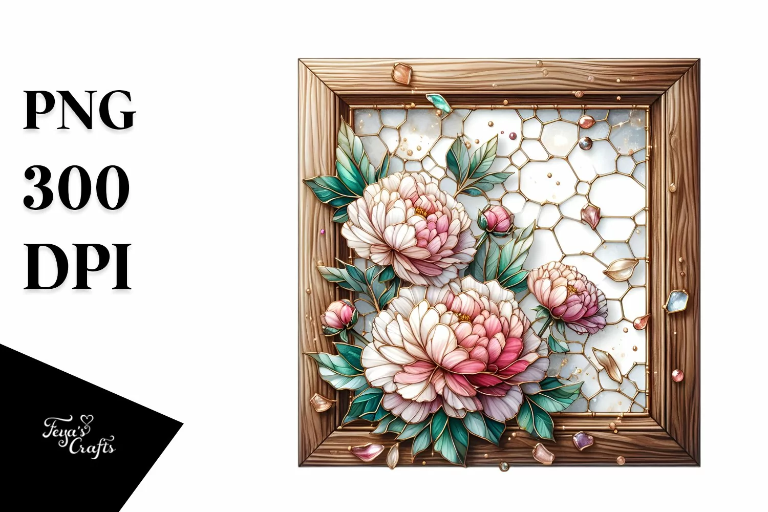 Wooden Frame with Stained Peonies | Sublimation | Clipart