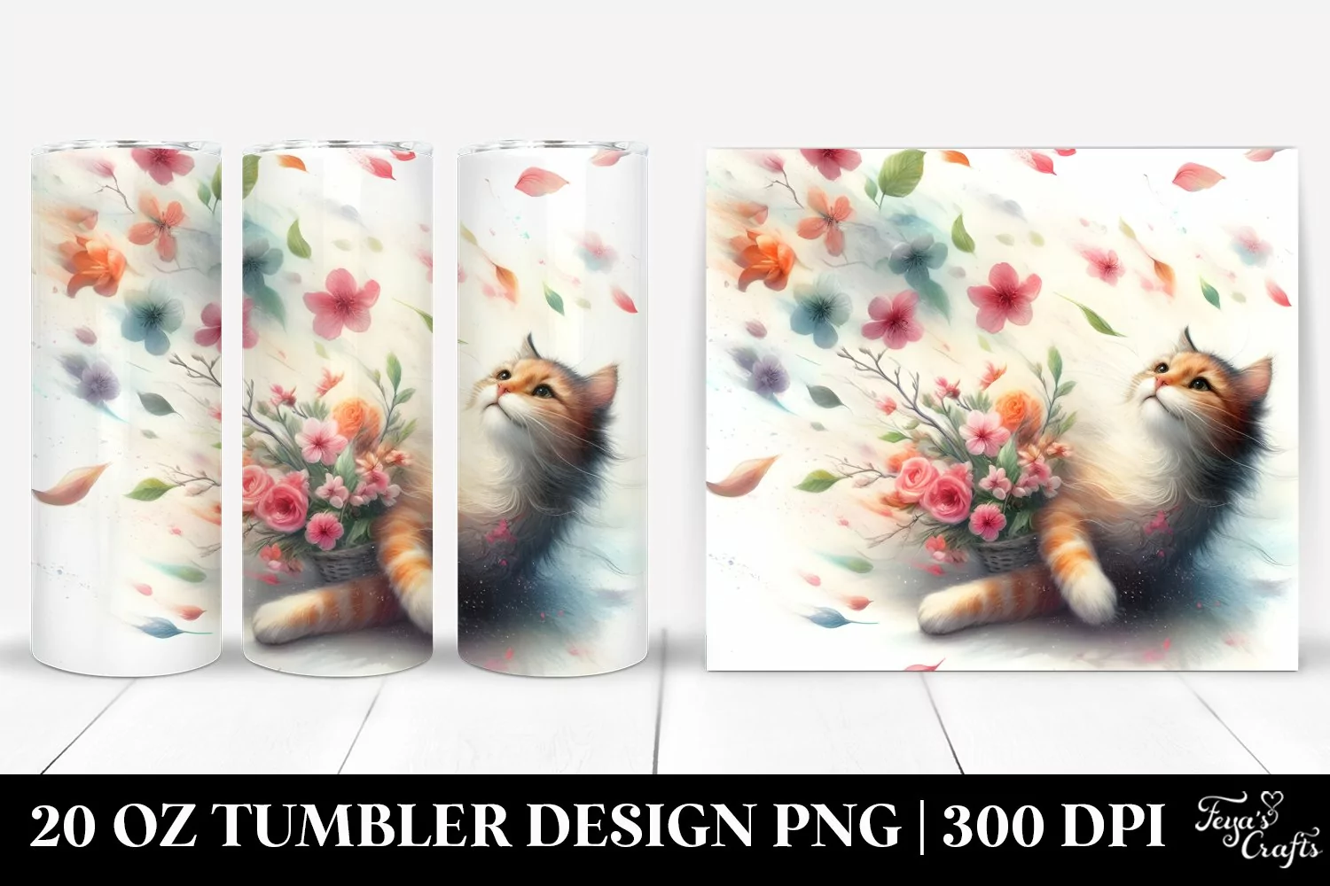 Watercolor Spring Summer Cat Pastel Scene Wind Petal Sublimation Tumbling