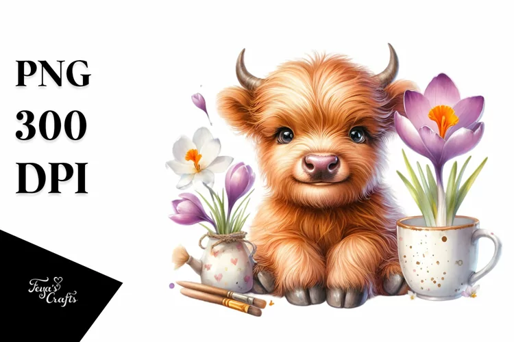Watercolor Highland Cow Crocus Splash | Sublimation | example image 1