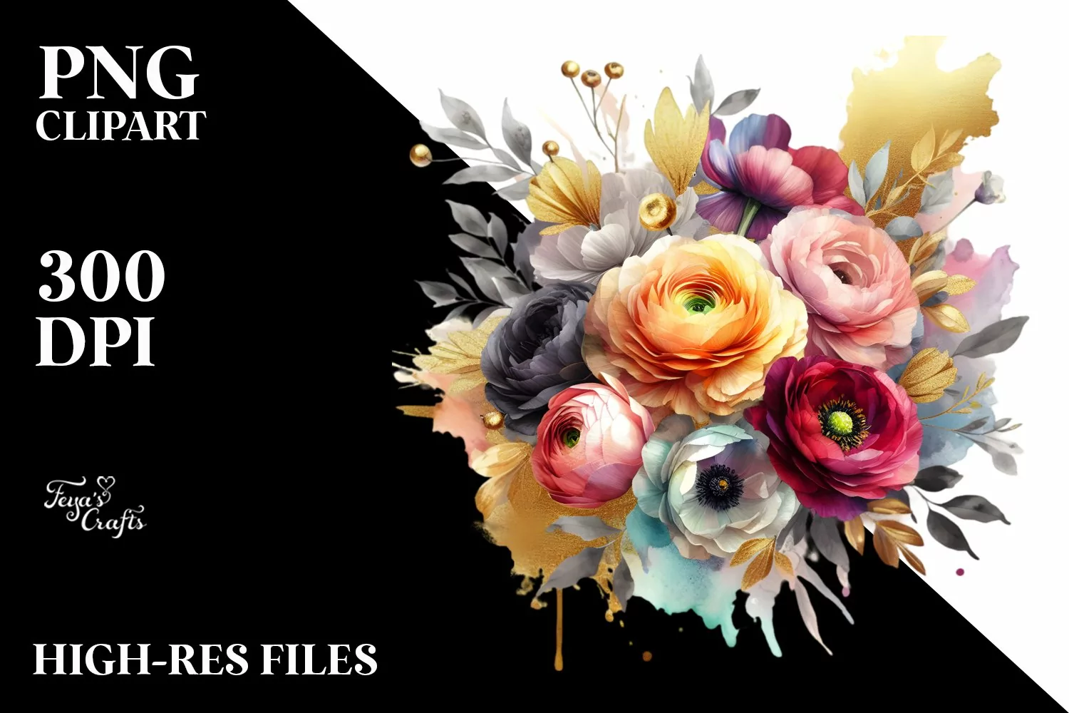 Colorful Ranunculus Splash Bouquet | Gold Foil Clipart example image 1