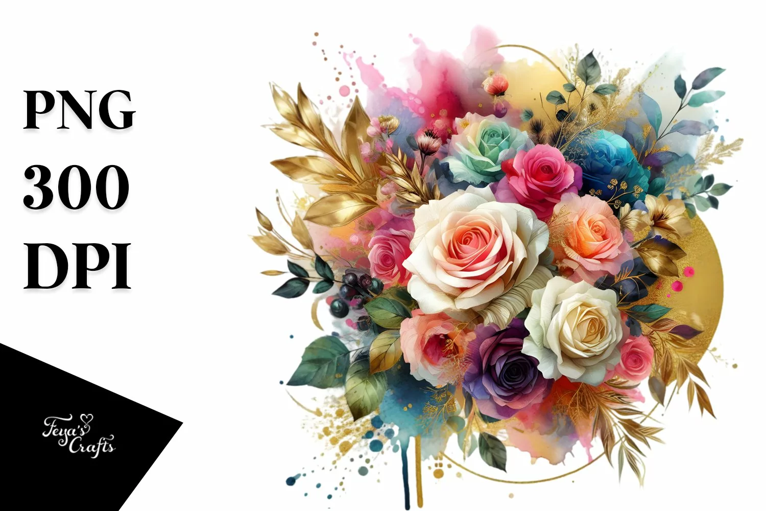 Watercolor Sticker Summer Easter Flower Png Roses Sublimation Goldfoil Abstractbouquet