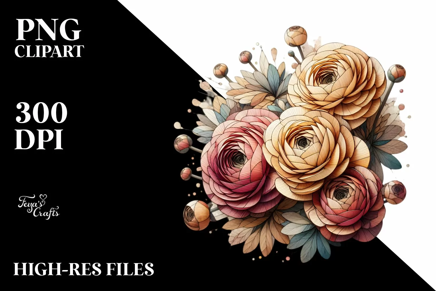 Wooden Stained Ranunculus Watercolor Splash | Sublimation |