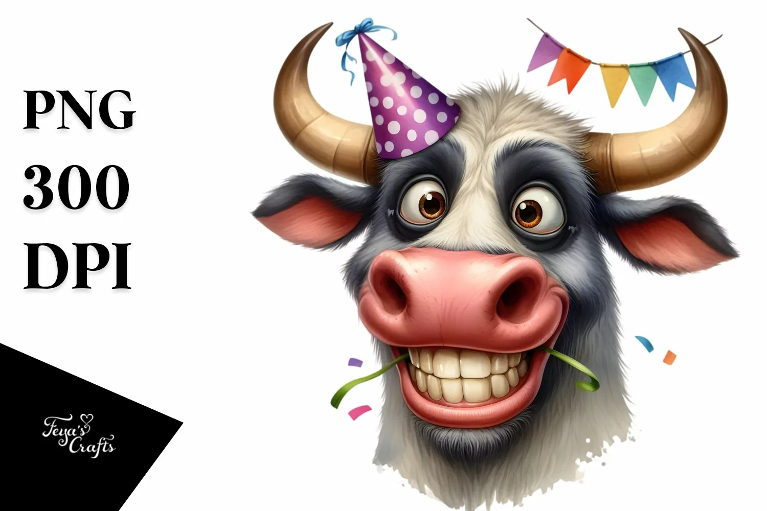 Funny Watercolor Clipart Bull Portrait Whitebackground Bigeyes Partyhat Caricature-like Elementsnottouchingthecanvasedges