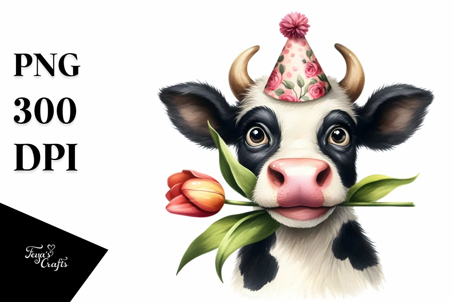 Cow Watercolor Cow with Tulip in Mouth | Sublimation Clipart example image 1