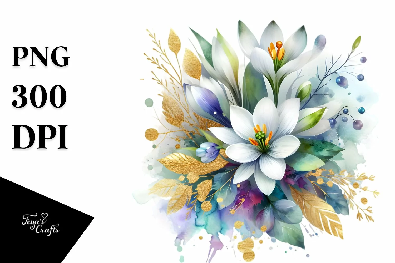 Watercolor Splash Abstract Vibrant Bouquet Png Sublimation Snowdrop Whitebackground Goldfoil