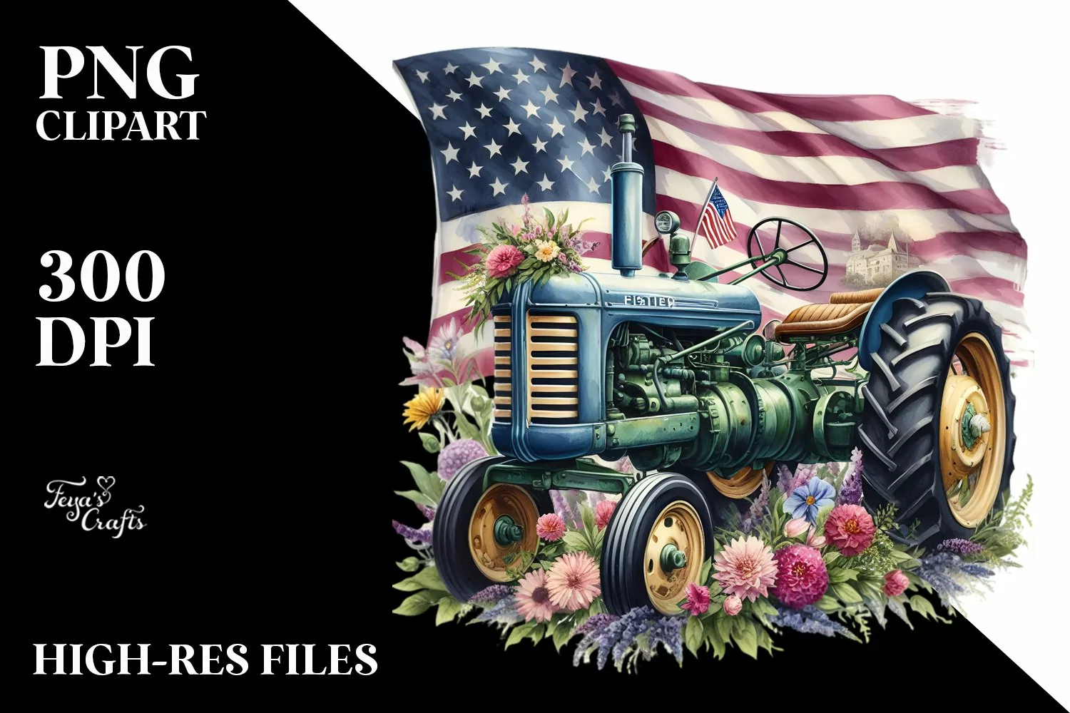 Vintage Tractor Flowers,USA Flag | Sublimation | Clipart example image 1