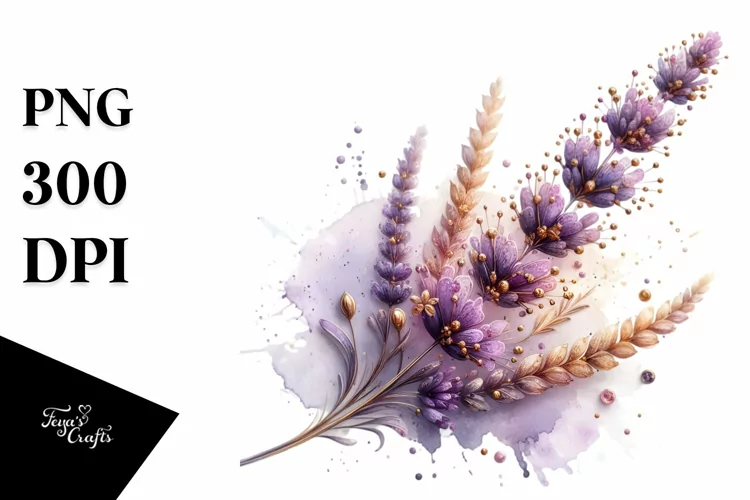 Watercolor Sticker Summer Flower Shiny Golden Lavender Abstract Png Sublimation