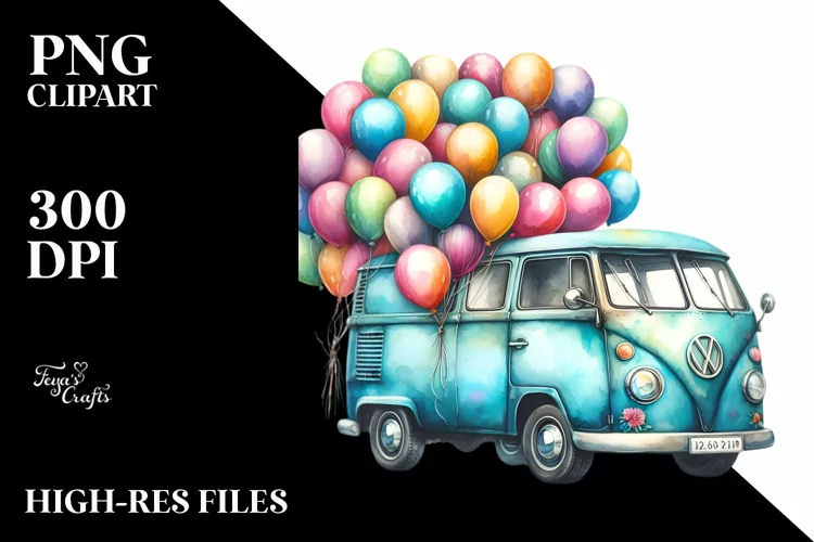 Watercolor Vintage Vibrant Van with Balloons | Sublimation