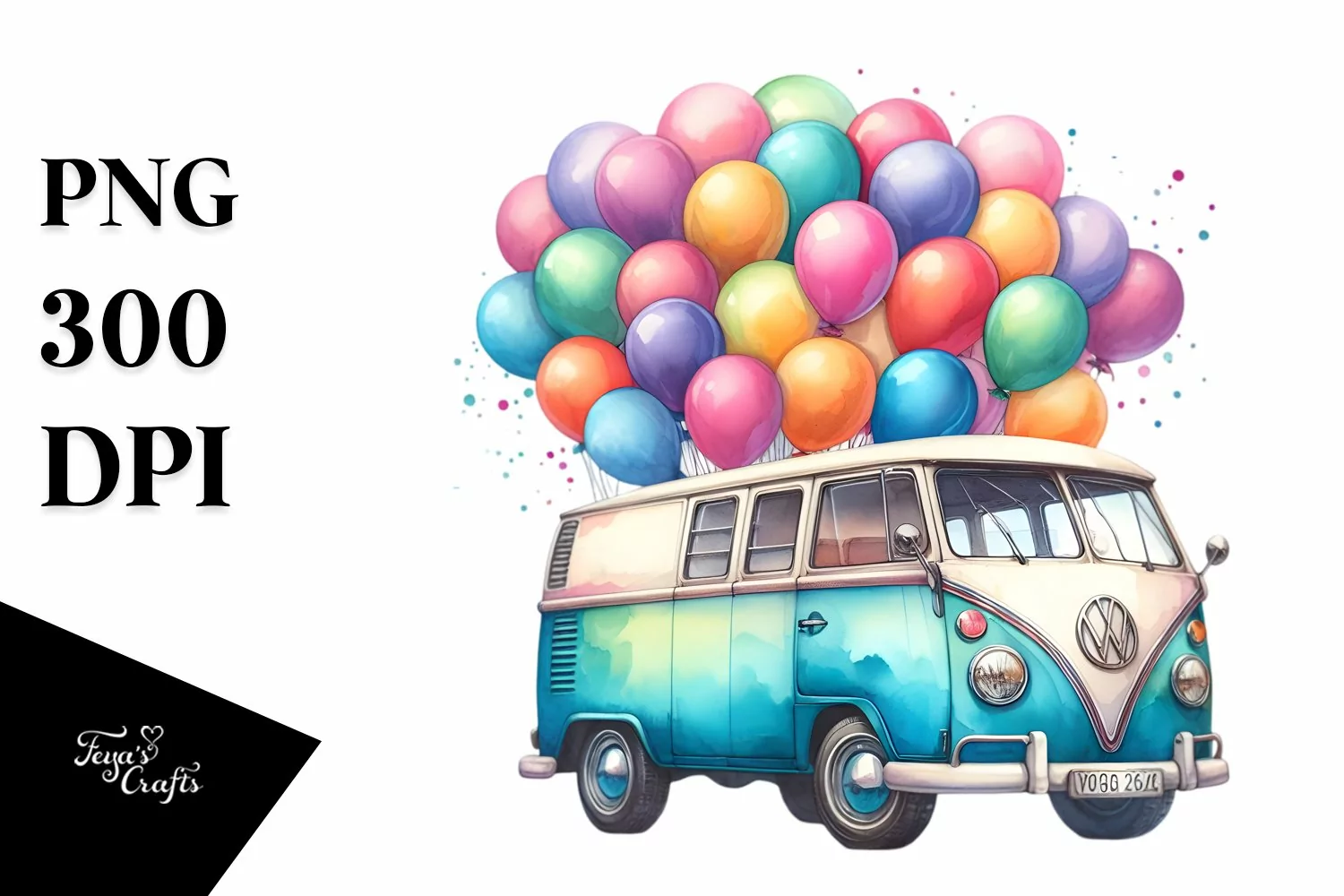 Watercolor Vintage Vibrant Van with Balloons | Sublimation example image 1