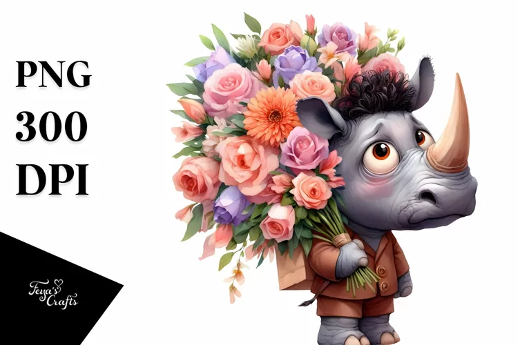 Expressive Rhino Sublimation Humanlike Bigeyes Largeflowerbouquet Carying