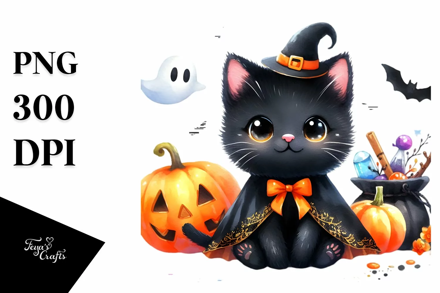 Cute Halloween Cat | Watercolor Clipart example image 1