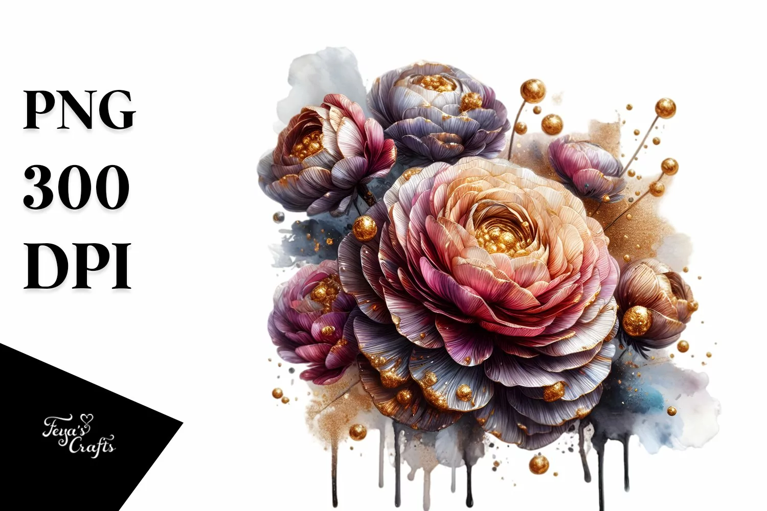 Watercolor Sticker Summer Flower Shiny Golden Abstract Ranunculus Png Sublimation