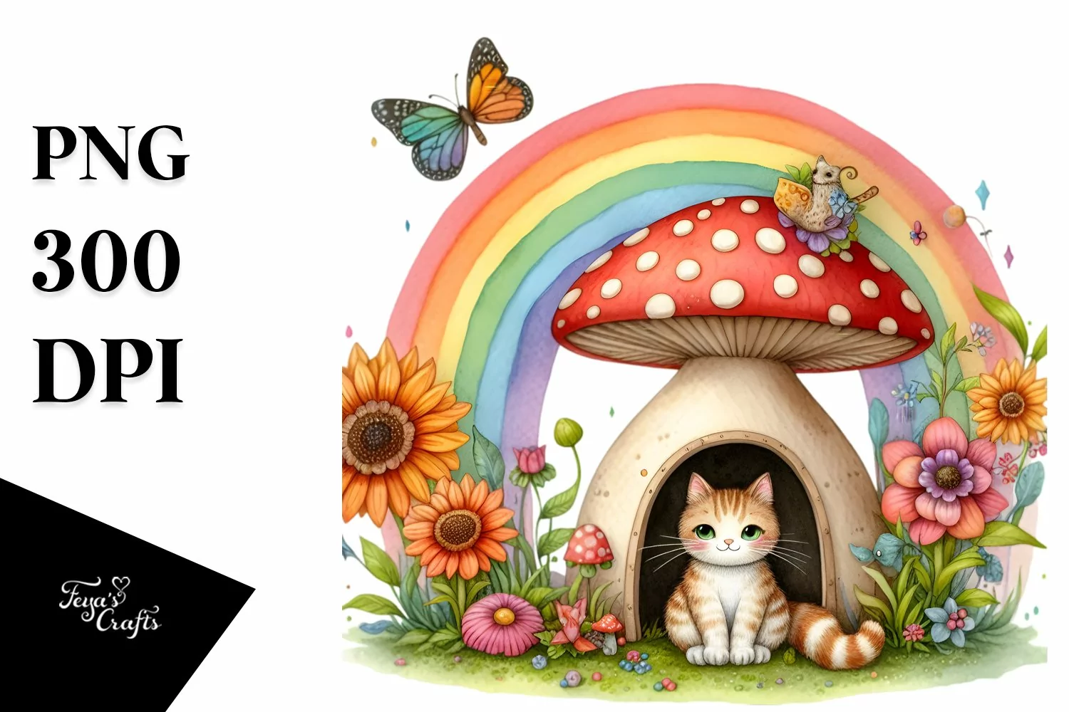 Vibrant Cat House with Colorful Mushroom | Clipart example image 1