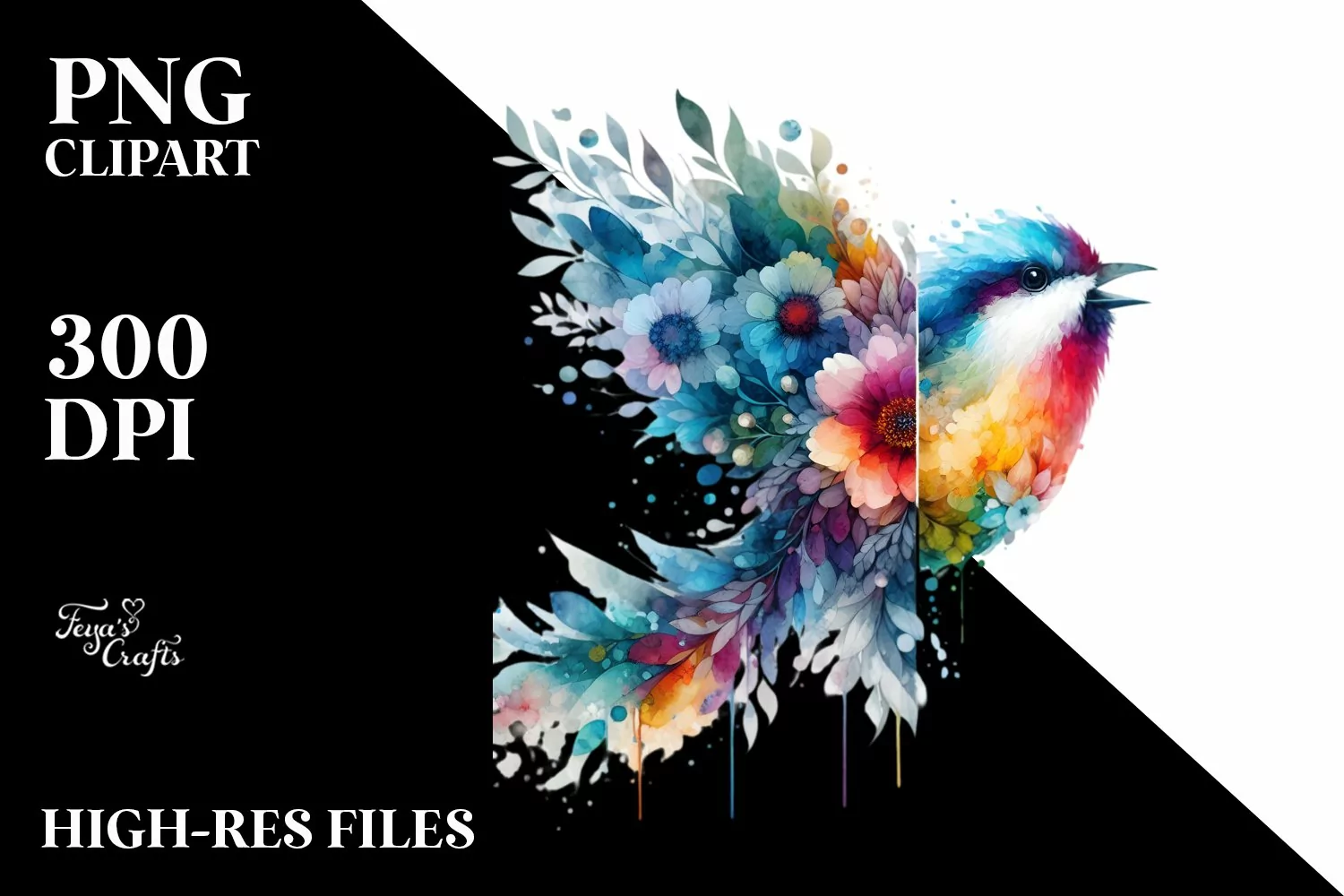 Vibrant Bird Half Flowers Abstract Watercollor | Clipart example image 1