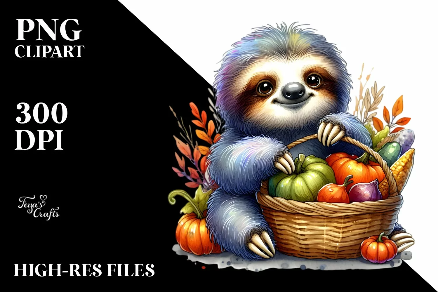 Watercolor Colorful Basket Quirky Whitebackground Babysloth Autumnvegetables Detailshigh