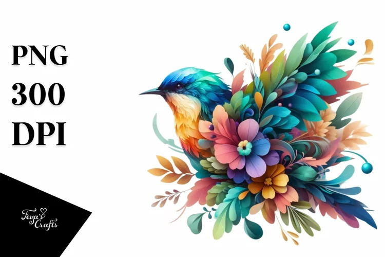 Vibrant Bird with Flowers PNG
